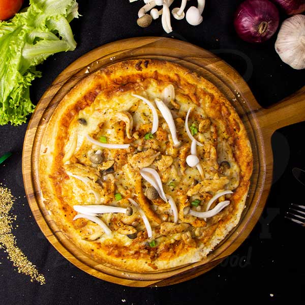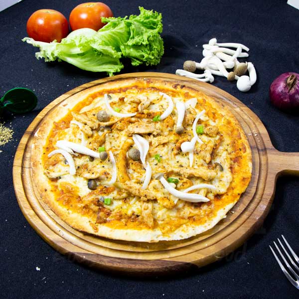 - Chicken Mushroom Pizza comes with handmade crust skin and homemade tomato sauce, topping with marinated chicken breast, shimeji mushroom, spices and assorted cheese.
