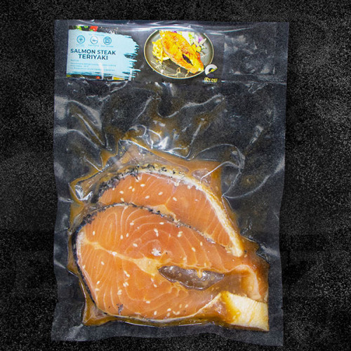 - A Atlantic salmon steak marinated with homemade teriyaki sauce and roasted white sesame. A little sweet and aroma.